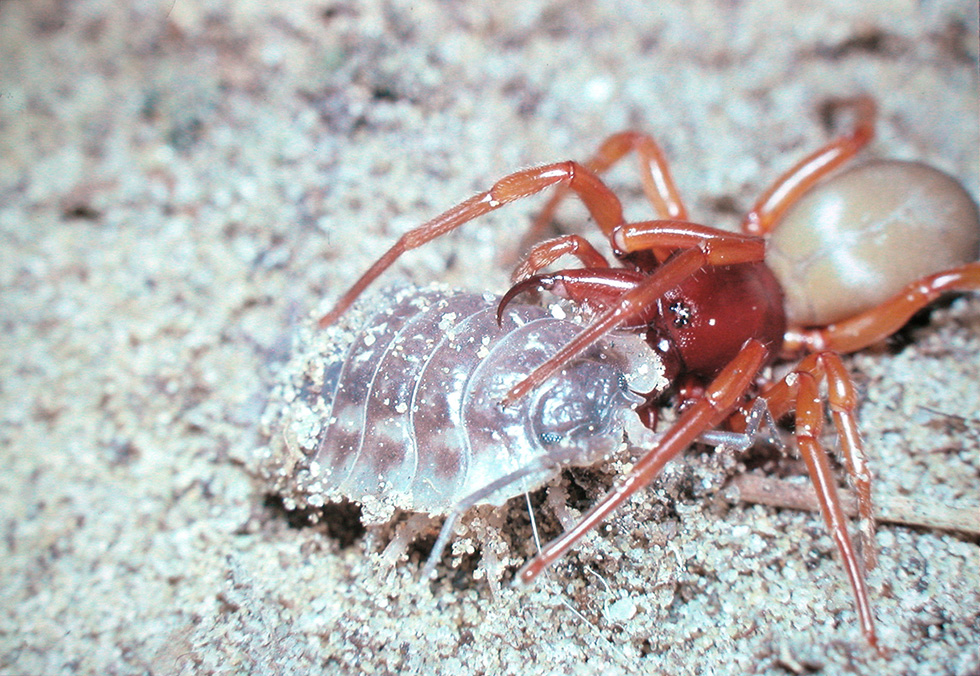 Vrouwtje Roodwitte celspin, deze soort is gespecialiseerd in jagen op pissebedden ©Ludwig Jansen